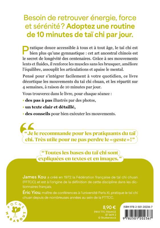 Pensé pour s’intégrer facilement à votre quotidien, ce livre décortique les mouvements du taï chi chuan, et les répartit sur 4 semaines, à raison de 10 minutes par jour.