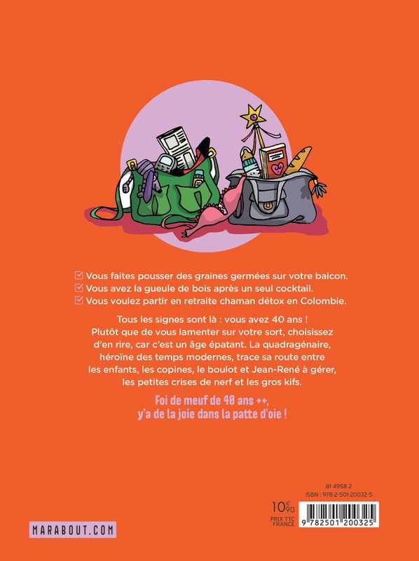 Plutôt que de vous lamenter sur votre sort, choisissez d’en rire, car c’est un âge épatant. La quadragénaire, héroïne des temps modernes, trace sa route entre les enfants, les copines, le boulot et Jean-René à gérer, les petites crises de nerf et les gros kifs.
