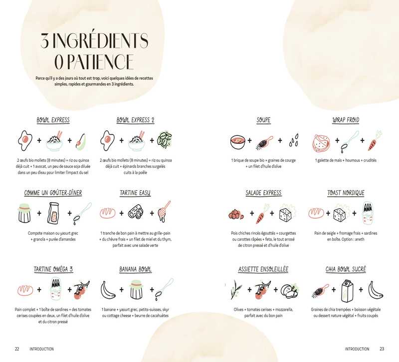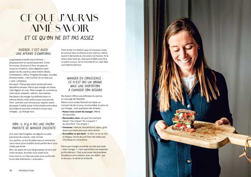 Parce que la grossesse s’accompagne souvent de mille recommandations plus ou moins adaptées, qui peuvent générer de l’inquiétude, Marion répond à toutes vos questions simplement, avec des conseils pratiques et adaptés. Pancakes protéinés à l’avoine, crackers au yaourt, gratin de ravioles et épinards, omelette verte, hachis parmentier végétarien, sans oublier quelques recettes pour se faire plaisir (gâteau rocher, gâteau fondant ricota framboise…), des idées de snacks à emporter partout ou encore des plats faciles à préparer à l’avance et à congeler pour un retour de la maternité l’esprit plus léger.