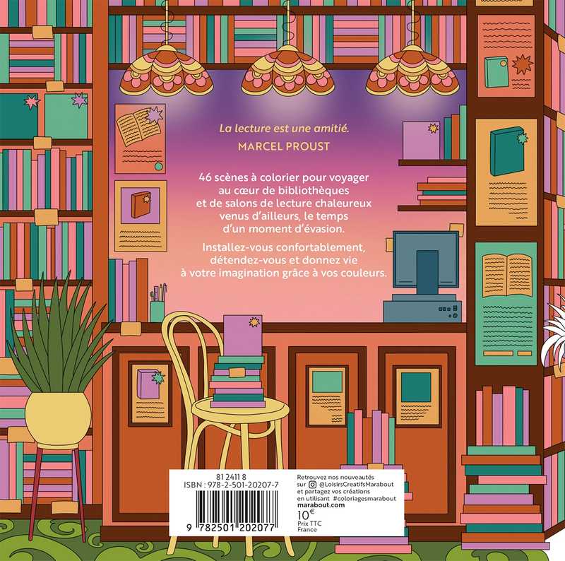 46 scènes à colorier pour voyager au coeur de bibliothèques et de salons de lecture chaleureux venus d’ailleurs, le temps d’un moment d’évasion.