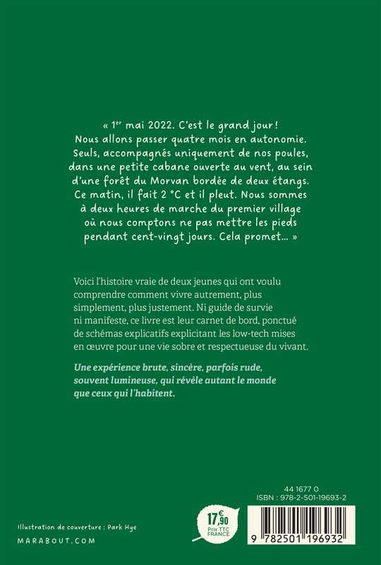 Nous allons passer quatre mois en autonomie. Seuls, accompagnés uniquement de nos poules, dans une petite cabane ouverte au vent, au sein d’une forêt du Morvan bordée de deux étangs. Ce matin, il fait 2 °C et il pleut. Nous sommes à deux heures de marche du premier village où nous comptons ne pas mettre les pieds pendant cent-vingt jours. Cela promet… »