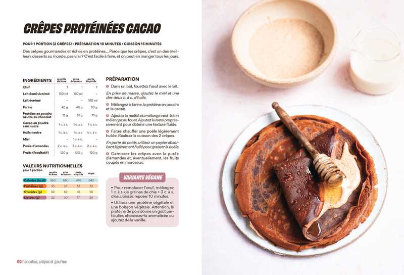 - 60 recettes pour l’entraînement quotidien, avec des adaptations si vous êtes en prise de masse ou en perte de poids.