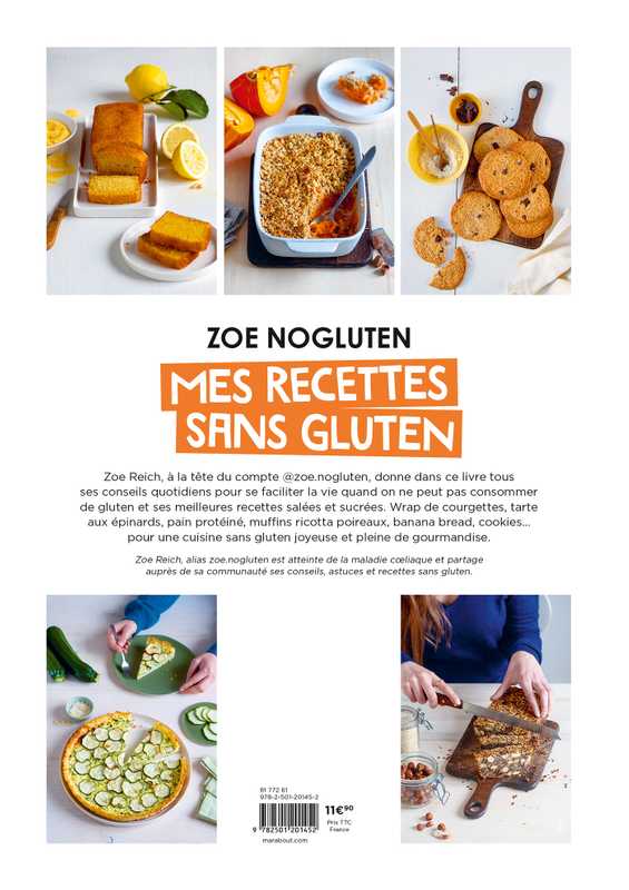 Zoe Reich, à la tête du compte @zoe.nogluten, donne dans ce livre tous ses conseils quotidiens pour se faciliter la vie quand on ne peut pas consommer de gluten et ses meilleures recettes salées et sucrées. Wrap de courgettes, tarte aux épinards, pain protéiné, muffins ricotta poireaux, banana bread, cookies… pour une cuisine sans gluten joyeuse et pleine de gourmandise.