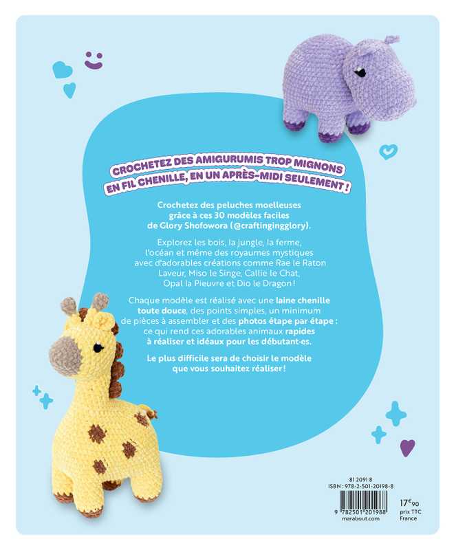 Chaque modèle est réalisé avec une laine chenille toute douce, des points simples, un minimum de pièces à assembler et des photos étape par étape : ce qui rend ces adorables animaux rapides