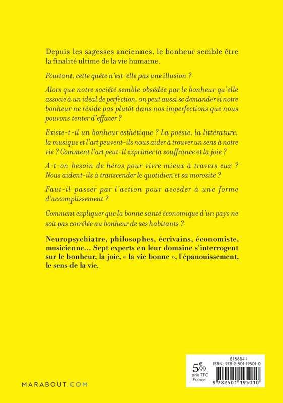 Neuropsychiatre, philosophes, écrivains, économiste, musicienne… Sept experts en leur domaine s'interrogent sur le bonheur, la joie, « la vie bonne », l'épanouissement, le sens de la vie.